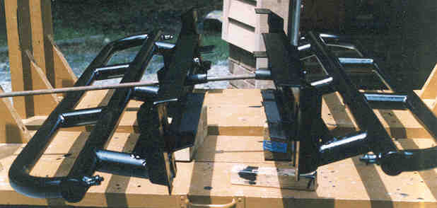 In the picture below, shown from left to right are the right side bars, cross member, and left side bars after having been treated with the POR-15 Metal Ready acid etch/zinc phosphate treatment. Photos were taken at this