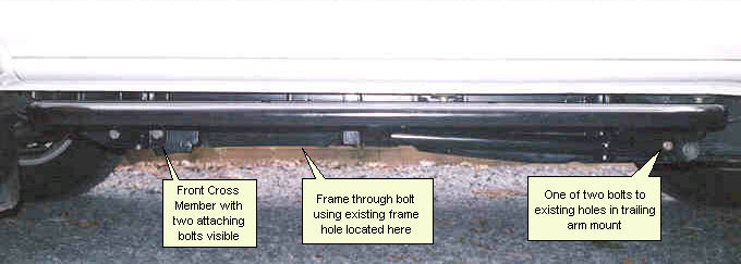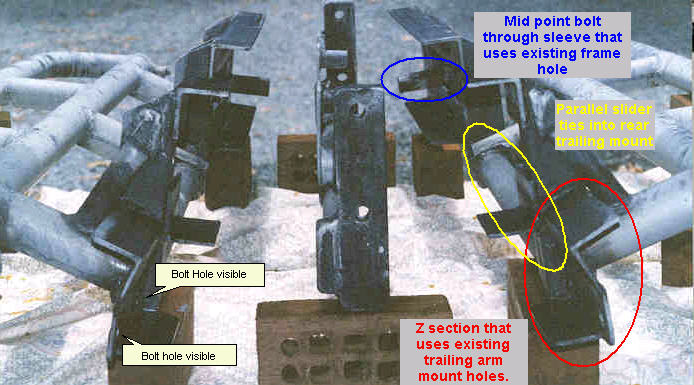 View of Rear Attachment Point The view below from left to right shows the left side bars, cross member and ridge side bar. The "Z" shaped construction in the foreground mates up with the rear frame attachment for the rear suspension trailing link and makes use of two existing holes as bolt the back end of the cradle to the frame attachment point..